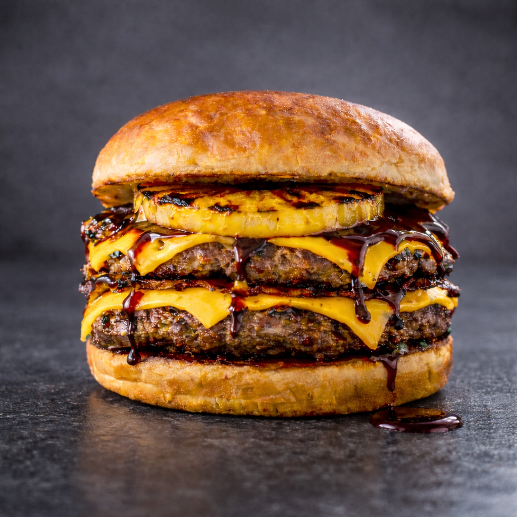Double In House smashed beef, Double cheese, Grilled pineapple, Teriyaki sauce.
