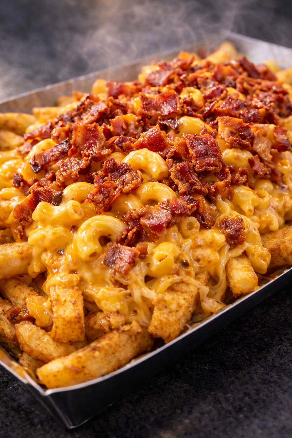 Crispy Skin-On Fries topped with House Macaroni Cheese, Crispy Bacon and Grated Cheese.