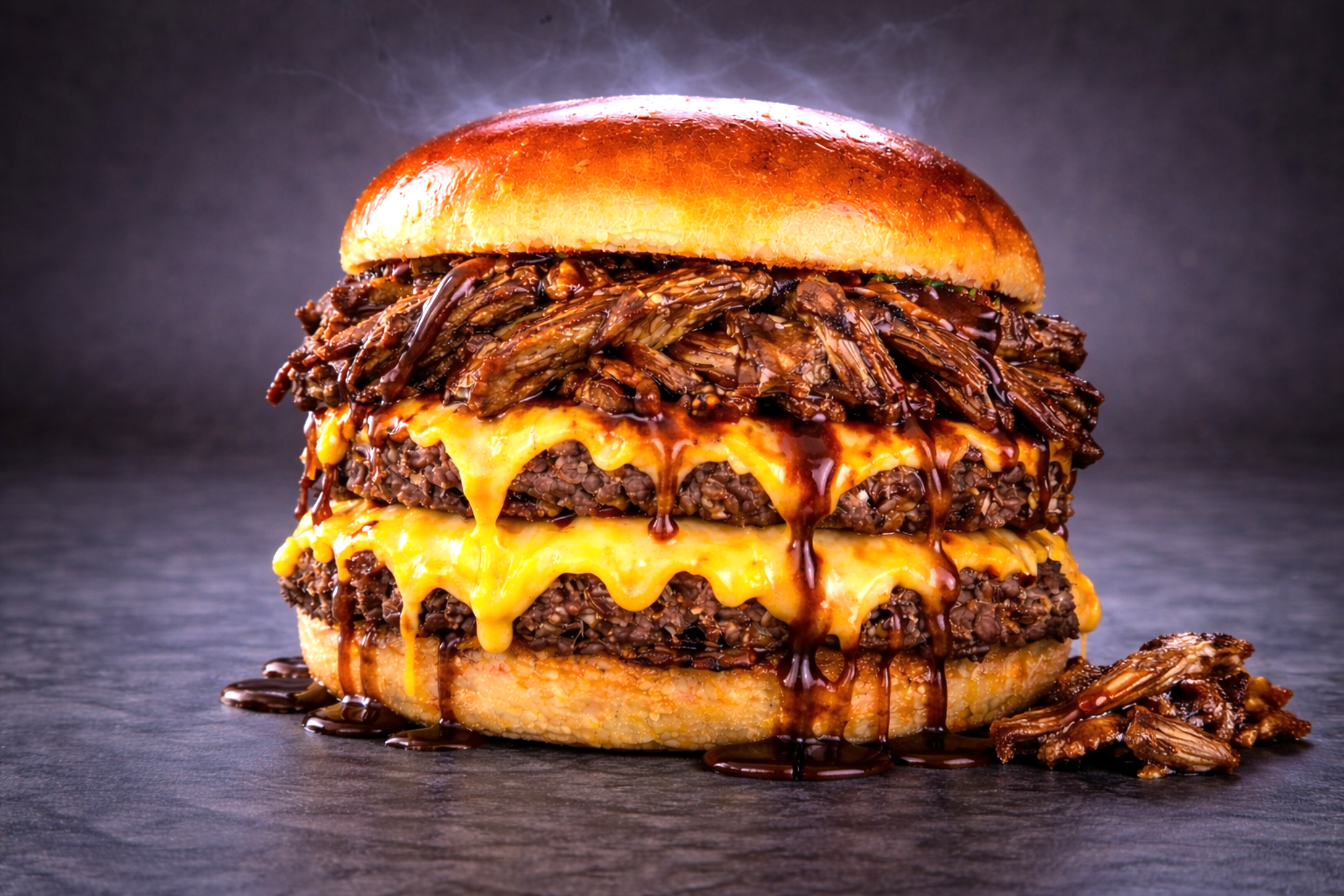 Double In House smashed beef, Double cheese, BBQ pulled pork, BBQ drizzle.