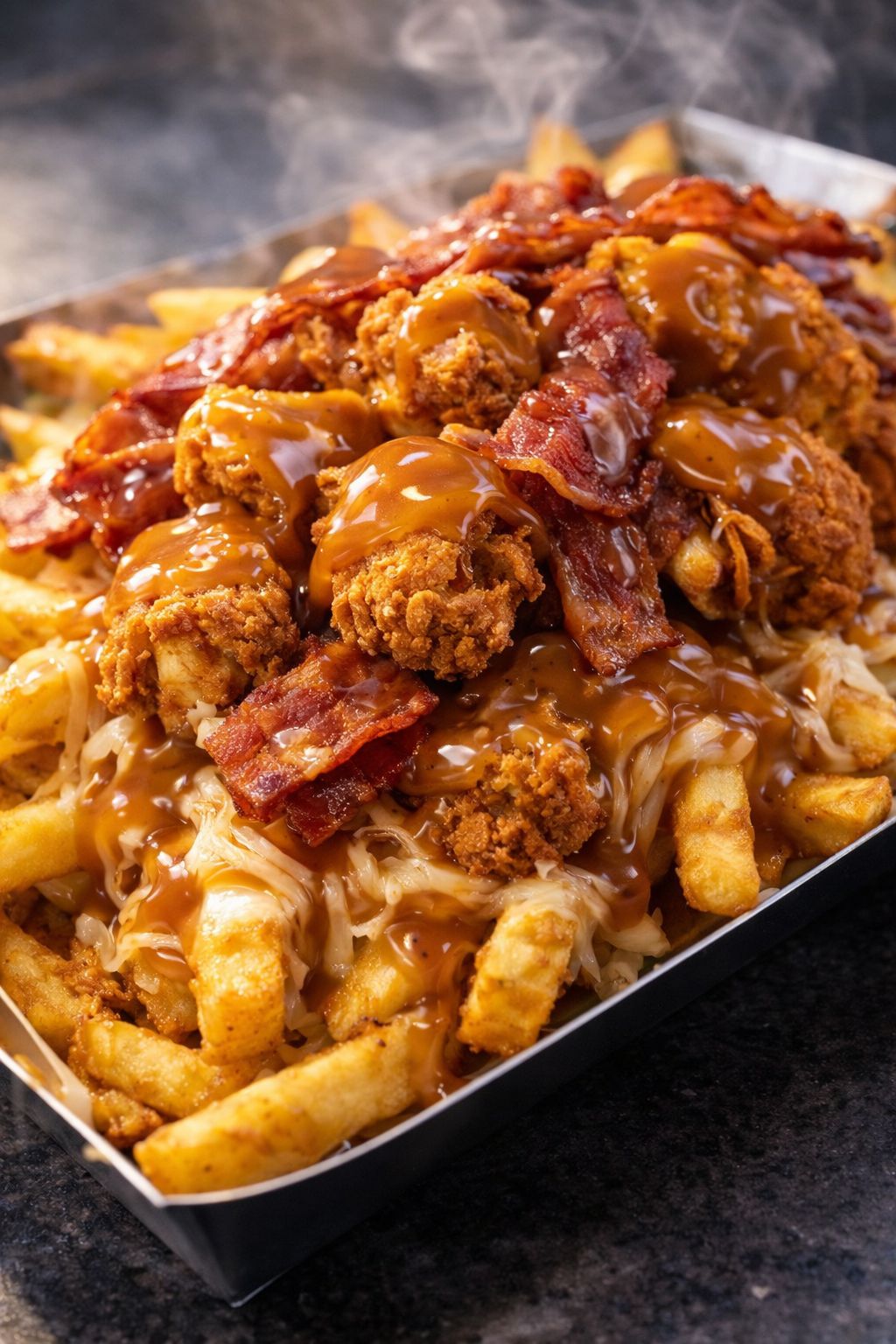 Crispy Skin On Fries, Grated Cheese, Southern Fried Chicken, Crispy Bacon Pieces, Gravy